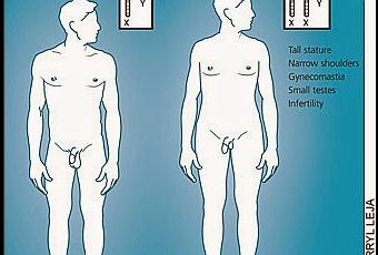 Un niño con un cromosoma X extra (XXY) desarrolla el síndrome de Klinefelter, el cual se caracteriza con problemas severos en el desarrollo cognitivo, genitales no desarrollados, y la presencia de caracteres sexuales secundarios femeninos como el busto.