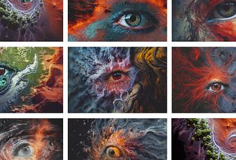 Creé esta serie generando dos tipos de imágenes con Midjourney: los ojos, que expresan diferentes tipos de emociones; los paisajes vistos por drones de un mundo hipotético que está naciendo. Luego integré en Photoshop las imágenes “mundos-ojos” que había emparejado usando criterios de tono y color asociados con la emoción expresada por el ojo.
