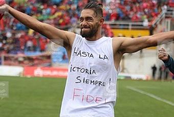 De inmediato el volante corrió un lado, se sacó la camiseta y mostró un polo con el mensaje: “Hasta la victoria siempre, Fidel.”