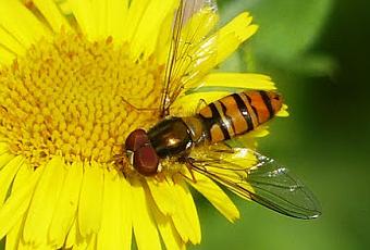 Así, no es difícil localizar al inconfundible Epysirphus balteatus, una especie que vuela durante todo el año, cuyo abdomen con bandas naranjas es muy característico, como bien se aprecia en este macho.