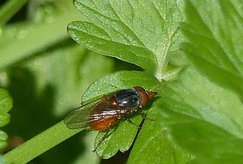 Entre las más llamativas se encuentran las del género Rhingia, que se caracterizan por su larga probóscide. Separadas por unos pocos metros pude detectar sendos ejemplares de las dos especies regulares en Asturias, por un lado Rhingia campestris, con dorso oscuro y abdomen de tono naranja fuerte