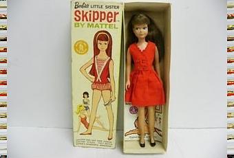 Skipper es la hermana pequeña de Barbie, nace en 1964, con la introducción de las muñecas Skipper. El patrón era una adolescente con un gran armario de ropa a juego con su hermana mayor Barbie. En 1965, se añaden dos amigos de Skipper , Skooter y Ricky.La primera muñeca Skipper sale al mercado en 1964 con el modelo #950 bañador rojo, la caja tiene fecha de fabricación en 1963 y los colores de pelo fueron rubia, pelirroja y morena.Sus ojos eran azules, cejas rojizas y labios color coral. Las primeras Skipper eran rígidas y posteriormente saldrian con piernas flexibles.Con respecto al vestido es el traje red sensation #1901 (1964-1965), es un vestido sin mangas de color rojo con bolsillo y 4 botones dorados, iba acompañado de un sombrero de paja con cinta roja, guantes cortos y calcetines blancos y zapatos rojos a juego. Este vestido es aún fácil de encontrar, pero el sombrero es muy dificil y cuando se encuentra tiene problemas por el desgaste de los bordes y la cinta roja. Esta muñeca es una Skipper original marcada del año 1963 con traje original y zapatos originales, le falta complementos que intentaré conseguir.