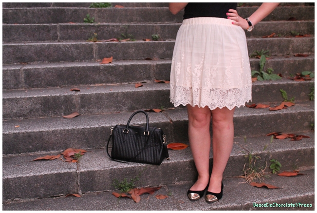 Hoy os voy a enseñar un look compuesto por una falda de encaje-crochet en color nude con camiseta básica negra y bailarinas negras con la puntera en dorado.