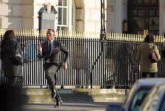 Damos ahora un salto en el argumento y nos situamos prácticamente en el último tercio del film. La captura de Silva (Javier Bardem) había sido planeada al detalle por él mismo. Y ya en Londres, utilizando sus múltiples recursos, escapa del control del MI-6 para ejecutar el atentado que finalmente acabe con la vida de M. Tras una persecución desenfrenada por varias estaciones de metro de la ciudad, Bond emerge por una de las escaleras de la estación de Westminster. M está prestando declaración en uno de los edificios oficiales del centro ante un comité especial de seguridad. Este será el escenario público en el que Silva planea desatar una orgía de sangre. Vemos a 007 correr por Whitehall, tratando de impedir que eso suceda, mientras M cita a Lord Tennyson ante la comisión en un montaje paralelo que considero un gran recurso técnico y una de las grandes aportaciones de Sam Mendes a la saga.