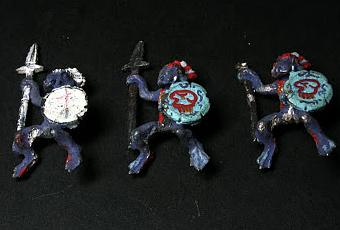 Los Slann son una de esas razas que siempre me han cautivado. Las primeras miniaturas de los Slann no se asemejan a la descripción realizada anteriormente. Realmente nacieron como unos sapos bípedos, erguidos y armados como guerreros. Nada que ver son las criaturas actuales de las que ya he hablado en este blog. Existieron incluso en Warhammer 40000 antes de su... desaparición. Me encantan los Slann y los tengo casi todos así que poco a poco les iré sacando fotos. La aparición de la raza Slann se produjo en Diciembre de 1993 y el Slann de hoy se anunció en en el número 53 de la revista White Dwarf de Mayo de 1984. Fue precisamente en este año cuando se produjo un verdadero desembarco de miniaturas de Lustria: Amazonas, Trogloditas, mas Slann, monstruos, etc. Por su tamaño se asemejaría uno de los actuales eslizones. Desde luego es el Slann más pequeño que conozco y por su antigüedad yo diría que conoció a los Ancestrales. Cuando me puse fotografiarlos mi sorpresa es que casi tengo un regimiento de caballería completo ya que tengo 4 figuras, aunque todas iguales.