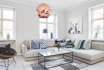 Esa es la primera sensación que nos vino a la cabeza nada más ver este piso: slow deco and slow life... Una expresión que ya tiene muchos adeptos y que vemos en cantidad de imágenes de inspiración. Un concepto que refleja muy bien esta bonita casa, en la que la armonía y la sencillez decorativa transmiten esa sensacíon de suavidad, serenidad y comodidad. Un estilo nórdico sin estridencias donde destaca la utilización de la gama de los azules en los complementos textiles, y donde el punto de tendencia lo ponen detalles como el estampado de chevron o el color cobre de las lámparas.