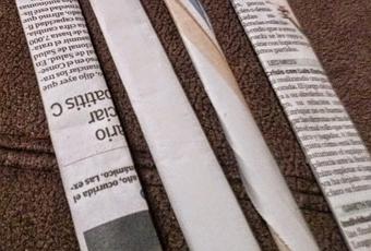 Cortaremos cada cara del periódico y haremos tiras con cada una de ellas. Las tiras las haremos enrollando cada cara en partes iguales, de forma parecida a una varita, pero aplastada. Si ponemos una página entera quedarán tiras muy gordas, por lo que es mejor cortar cada página por la mitad y trabajar solamente con caras del periódico, como se puede ver en la foto.