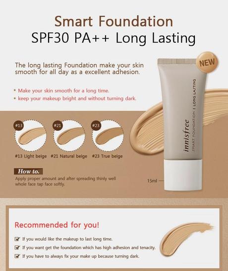 Innisfree Longlasting Smart Foundation:Indicada en casos en los que se desea que el maquillaje dure más tiempo, promete mantener la piel uniforme, suave y con el maquillaje intacto durante mucho tiempo. Esto fue lo que me hizo decidirme por ella, ya que lo que quería era una base que usar en verano y de cara a algunos eventos en los que tenía que estar maquillada bastantes horas y esta me prometía precisamente eso. Tiene un factor de protección solar de 30, que nunca viene mal, aunque en esta época me parece poco, pero tampoco me preocupa, ya que aplico protector solar igualmente, lleve la base que lleve.