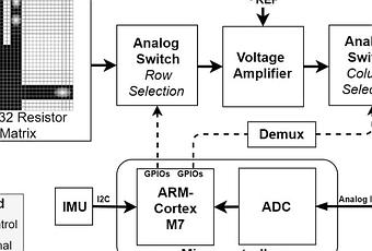 El dispositivo SmartHand utiliza una rejilla sensora táctil resistiva de bajo costo, basada en un compuesto de polímero conductor, que se pega a un guante. Se adjunta una unidad de medición inercial (IMU) en la parte posterior del guante para proporcionar información adicional sobre el movimiento. Los datos de los 1024 sensores táctiles (dispuestos en una cuadrícula de 32 por 32) y la IMU se introducen en una placa de descubrimiento STM32F769NI conectada a la muñeca a través de una serie de cables. Esta placa contiene un núcleo Arm Cortex-M7 que funciona a 216 MHz, con 2 MB de memoria flash y 532 kB de RAM.