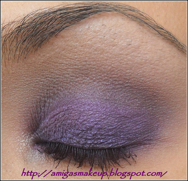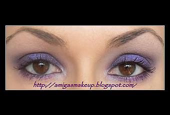 Sombra Violeta con destellos Azules Inglot 439 perfilando la parte superior del párpado móvilSombra Violeta con destellos rosas Inglot 441 encima de la anterior (párpado móvil) hasta la cuenca del ojo sin excedernosSombra Gris mate 120 Matte Rainbow en la cuenca del Ojo y Marcando la "V" externaSombra Trax(morada con destellos dorados) de Mac encima de la anterior difuminándola por la bananaSombra 352 rosado mate para iluminar el arco de la ceja