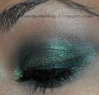 Marcamos "V" con una sombra grisácea 340 Matte y subimos por la cuenca y encima de ella aplicamos la sombra iluminadora verde-amarilla 16 para dar un toque de brillo