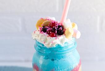 Para acabar nuestro súper smoothie helado lo hemos coronado con nata montada, mini nubes, frutos rojos y sprinkles rosas. Por supuesto esto último es totalmente a tu eleción!