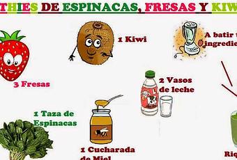 Añadimos a la licuadora una taza de espinacas (yo usé congeladas, pero puede ser frescas). Lavamos, quitamos lo verde a las fresas, las troceamos y añadimos a la licuadora. Pelamos en kiwi, lo troceamos y lo metemos en la licuadora, añadimos una cucharadita de miel y dos vasos de leche desnatada (puede ser cualquier otro tipo de leche). Batimos todos bien durante unos minutos, servimos en un vaso y listo para tomarlo.