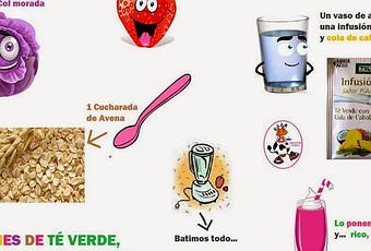 Ingredientes:100gr de Col morada4 Fresas1Cucharada de avena1 Vaso de agua1 Infusión fría de te verde y cola de caballo