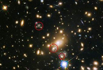 La mayor parte de los puntos brillantes de la imagen son galaxias de este cúmulo. La supernova real, llamada supernova Refsdal, se produjo una vez en un lugar muy lejano del Universo y muy por detrás de este cúmulo de galaxias. La gravedad provocó que el cúmulo actuara como una lente gravitatoria masiva y que la imagen de la supernova Refsdal se fragmentara en múltiples imágenes brillantes. Una de estas imágenes llegó a la Tierra hace unos diez años, probablemente en el círculo rojo superior, y se perdió. Las cuatro imágenes adicionales alcanzaron el nivel máximo durante abril (en el círculo rojo inferior) repartidas alrededor de una galaxia masiva del cúmulo como la primera supernova Cruz de Einstein. Pero había más. Las análisis revelaron que la imagen de una sexta supernova brillante parecía seguir su camino a la Tierra y podría llegar el próximo año. A principios de este mes -justo a tiempo- se captó esta sexta imagen (en el círculo rojo del medio) tal como se había predicho. El estudio de secuencias de imágenes como esta ayuda a entender cómo se distribuye la materia en los cúmulos y galaxias, la velocidad de expansión del Universo y cómo estallan las estrellas masivas.