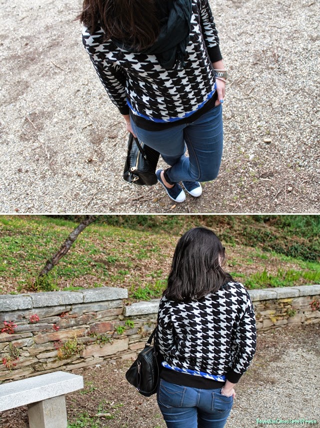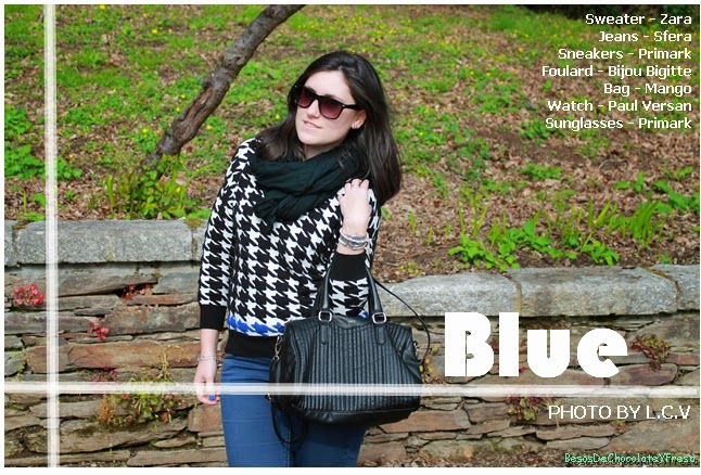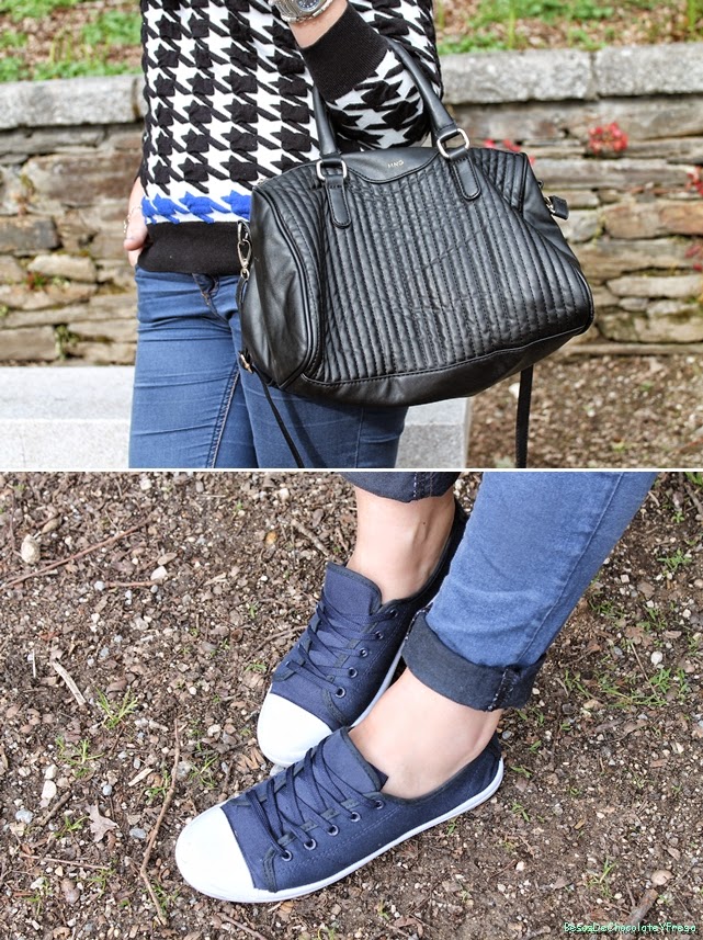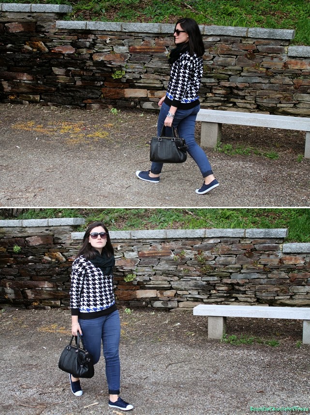 Hola!! ¿Qué tal? Me encantan estos looks cómodos para ir dar un paseo con mi chico y tomar algo de relax. Este look me lo puse la semana pasada aprovechando los días primaverales y el buen tiempo para pasear y relajarse. Para ello combiné mis sneakers azules marino y blancas que aún no os había enseñado, con jeans básicos y sweater con estampado de pata de gallo y nota de color azul. Como complementos bolso tote negro y foulard negro. Espero que os gustase Besitos y feliz día ** Gracias por vuestros comentarios y visitas