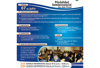 La Sociedad Bíblica Católica Internacional, organiza para el mes de julio el II Diplomado Bíblico en Evangelios, programa de especialización dirigido a profundizar el mensaje de los Evangelios, durante el segundo semestre del año.Este programa se iniciará el 7 de julio, bajo la modalidad semi-presencial, y se dictará en el Instituto Pedagógico Nacional, sito en Avenida Morro del Solar, cuadra 9, distrito de Surco. El objetivo es profundizar, ampliar y actualizar el conocimiento de la fe, desde la perspectiva y metodologías que permitan fortalecer la fe en Jesús, Camino, Verdad y Vida.