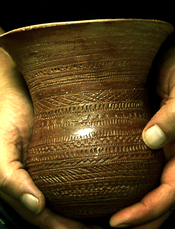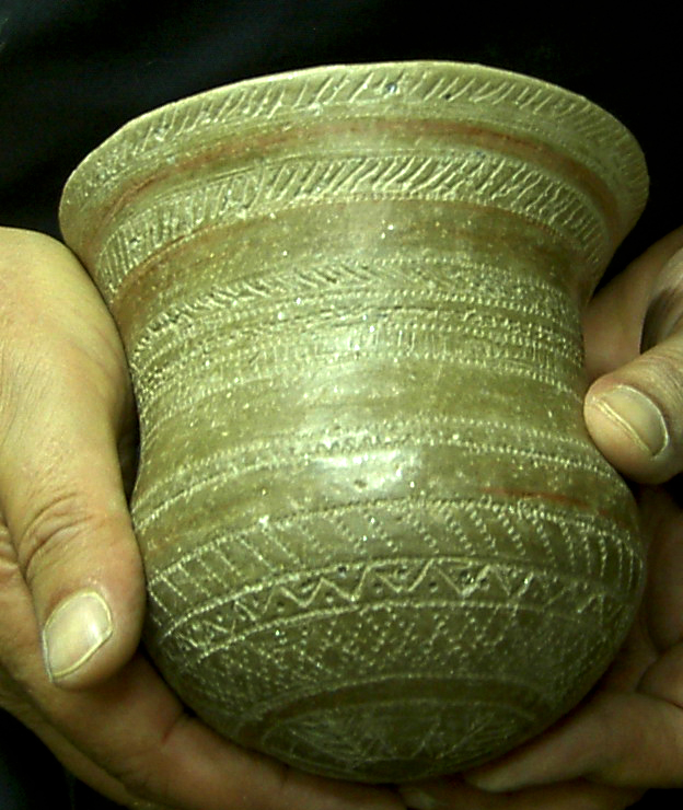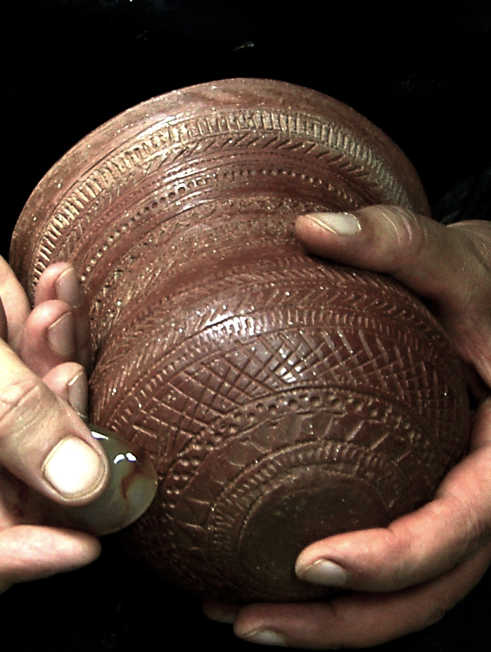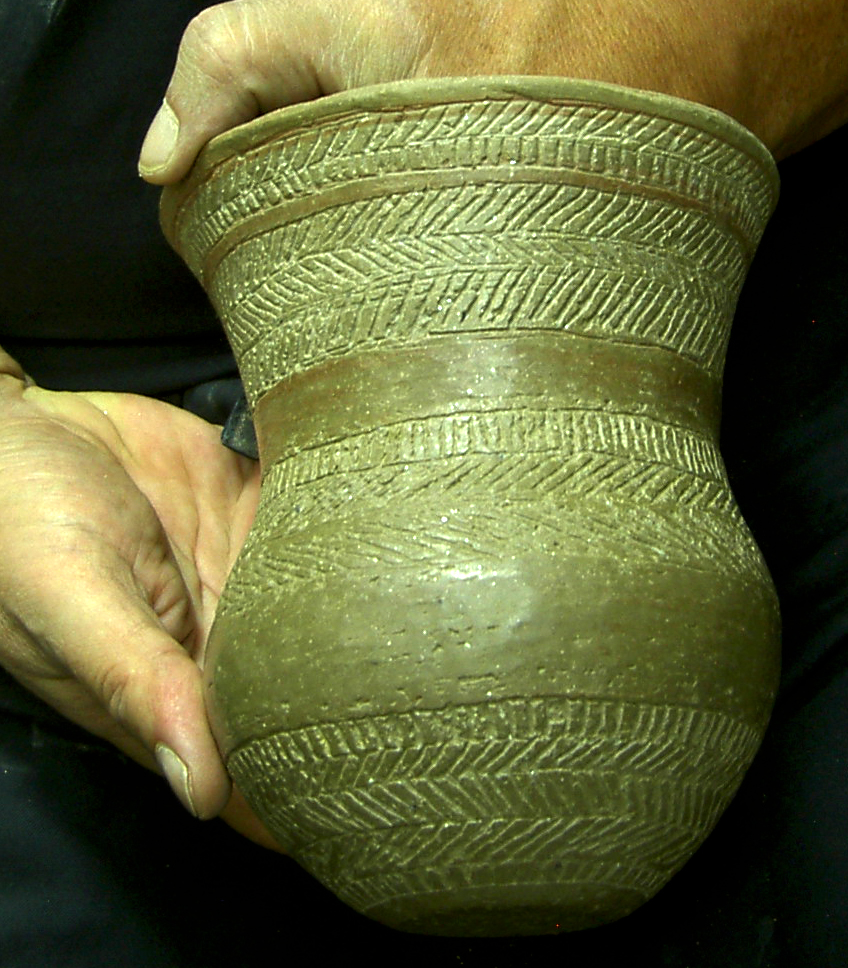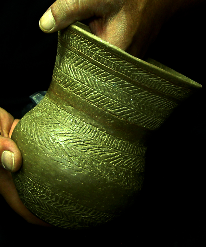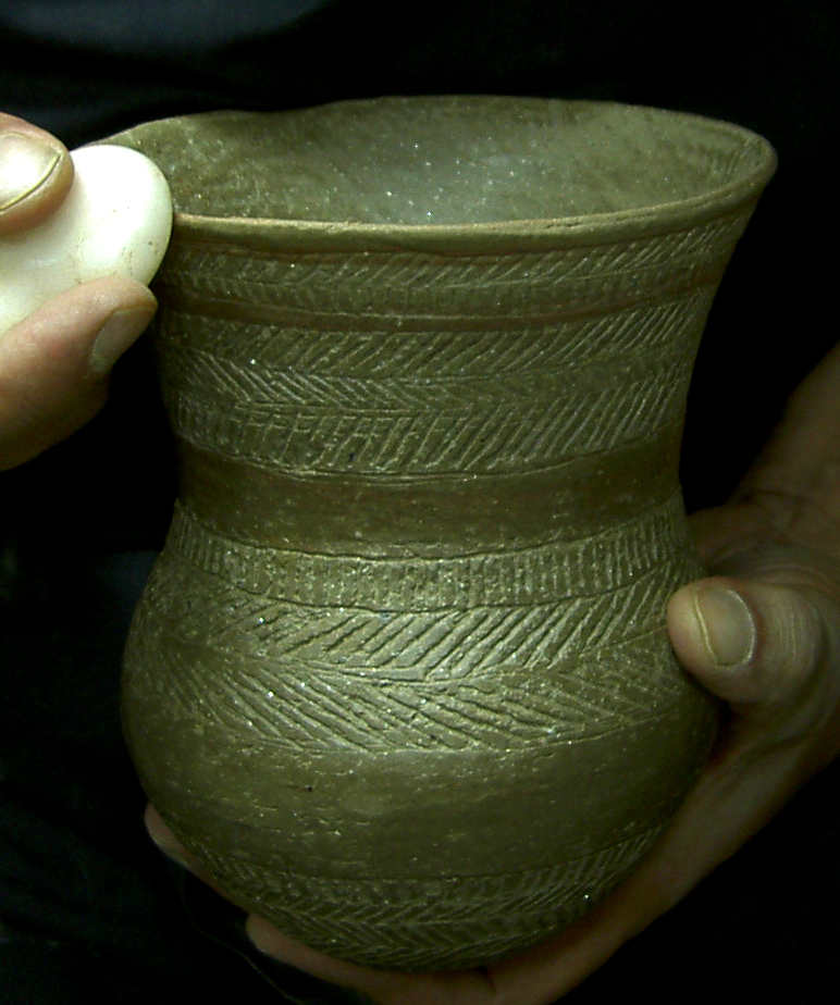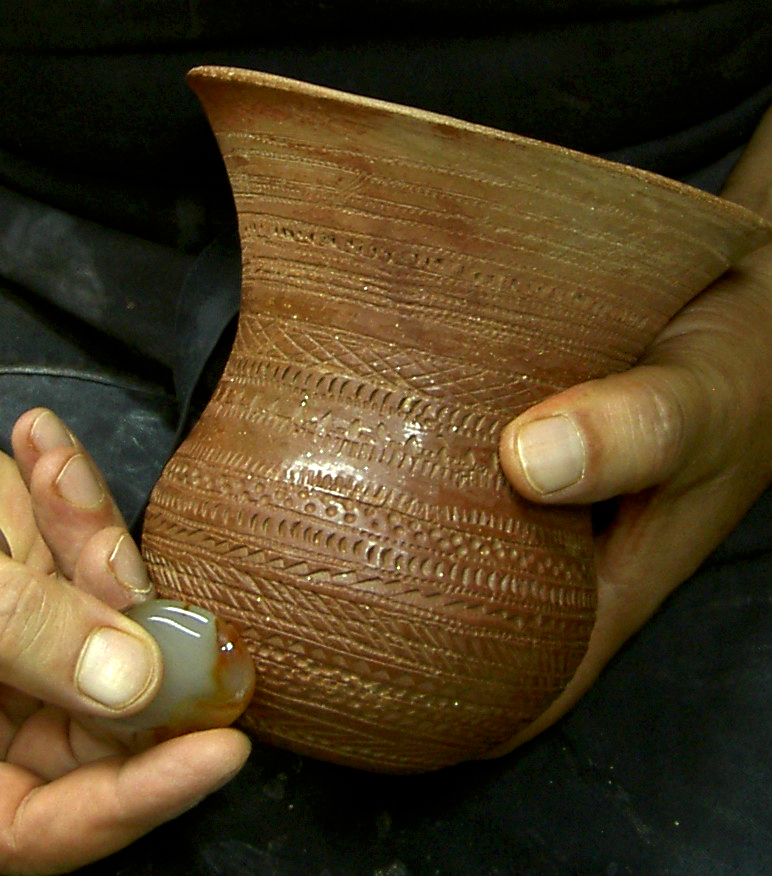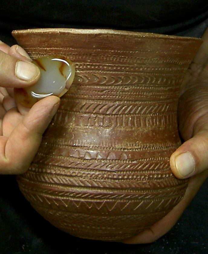 La decoración la forman líneas paralelas formando bandas alternas rellenas con retícula de líneas oblicuas y, entre bandas, un esquema repetido de línea de puntos impresos entre líneas también puntilladas. Junto al borde y en el circulo basal, secuencia de triángulos también puntillados. Campaniforme listo para cocción.Utilizaré una ruedecilla como instrumento para todas las impresiones, excepto las líneas de puntos que van a punzón.También una pasta con desgrasante fino que, aunque no será perceptible al ser engobada l pieza antes del bruñido, me permite trbjar cn una consistencia similar a la de la pieza a reproducir, muy arenosa según la descripción del Marqués de Loriana. Ello afecta a la rigidez durante el secado, por lo tanto tiene sentido hacerlo así si se quiere experimentar la técnica.El engobe permite mejor bruñido.Nos dicen los autores del trabajo citado que el estudio detallado de las técnicas decorativas con las que ejecutaron las decoraciones campaniformes ha sido uno de los aspectos más olvidados por la investigación. Ello habría perpetuado ciertos lugares comunes que jamás han sido argumentados, y analiza el de la técnica incisa en el sentido de su interpretación como un elemento diferenciador fundamental de la cronología, y los aspectos cultural y étnico.El bruñido interior es delicado por la fragilidad.Según estos autores un análisis de detalle de las técnicas decorativas campaniformes indicaría lo contrario, aseverando que “se puede constatar una clara continuidad técnica en la ejecución de las decoraciones a lo largo de toda la secuencia estilística campaniforme peninsular.Se refieren no a la estructura y características de los diseños ejecutados, bien distinta entre los tipos cordados, marítimos y Ciempozuelos, pero sí a la técnica con que fueron realizadas todas las decoraciones campaniformes.Almagra o engobe a base de óxidos de hierro.La conclusión primera es que todos los vasos campaniformes son impresos. Pero variando el instrumento empleado: una cuerda, un peine en los marítimos, y un peine liso en los llamados incisos.El bruñido reduce las aristas si se han hecho líneas incisas previas al puntillado.Se remiten a las investigaciones de Salanova, en Francia, quien ha demostrado que las líneas impresas con peine se conforman por diversos tramos de longitudes semejantes, obtenidos mediante la aplicación sucesiva de corto instrumento dentado, mayoritariamente “tramos rectilíneos de 20-25 mm. de longitud y formados por entre 15-20 dientes regulares para los trazos oblicuos”, afirmando identificar el instrumento utilizado para la impresión con la célebre concha del Cardium. Campaniforme impreso con líneas de triángulos, oblicuas y cruzadas en retícula.Validando esta conclusión, no cabría hablar de técnica incisa. Apoyándose además en la ausencia de rebabas que produce la incisión, si bien matizando que el bruñido superficial las eliminaría, al menos parcialmente. El bruñido en seco exige mayor presión.Este argumento quizás no ha considerado el escobillado de la pieza, previo al bruñido, que hace desaparecer las rebabas.Las piezas de cerámica más delicadas del calcolítico.Clarísimo es el argumento de la diferencia de aplicar impresión o incisión a los círculos pequeños de la base de los vasos. Señala ejemplos de composición de estos círculos a base de segmentos rectos, conformando polígonos. Esta imperfección no se da cuando se usa un punzón para trazar (incisión), pues se trabaja con el ángulo de inclinación. Campaniforme engobado de gris castaño.Mi humilde parecer es que si el instrumento es ruedecilla y no peine, sí es posible jugar con la inclinación y obtener círculos bien conformados, aunque más difícil cuanto menor el radio.En todo caso el argumento busca reforzar la hipótesis de una continuidad técnica, y, por ende, mayor relación entre el estilo llamado inciso y los tipos marítimos antiguos, con independencia de las claras diferencias en las características y organización de los motivos decorativos.Técnica de excisión combinada con puntillado. Por tanto, todos los estilos campaniformes serían impresos y sería el instrumento utilizado el condicionante de la técnica, siendo los diseños fruto de la evolución estilística de ese continuum técnico.Decoración con punzón dentado de madera.La cuestión es del mayor interés, pues los intercambios culturales vienen estableciéndose por paralelismos técnicos y esquemas decorativos dentro de un esquema cronológico atento a otros factores añadidos.Campaniforme marítimo. Oblicuas en bandas. Así, citan que Alday considera, en función del incremento de hallazgos de vasos de estilo marítimo o impreso en sentido clásico,m mucho más probable la existencia de una ruta terrestre que atravesando la Meseta, pasaría los Pirineos, por un lado hacia Cataluña y la costa levantina, y por otro hacia el País Vasco, y bajaría descendiendo hasta la zona de Soria por el valle del Ebro y, desde allí, a través del valle del Duero, enlazaría con el valle del Tajo por su cuenca alta, llegando a Portugal. Vaso terminado.Las consideraciones sobre la dificultad técnica de levantar el vaso, perfilarlo, engobarlo, imprimirlo y bruñirlo han sido expuestas con carácter general en varias entradas anteriores sobre el campaniforme, (réplicas de vasos campniformes), aparte de las consideraciones experimentales hechas, con toda modestia, al hilo de comentar el estudio citado, quisiera recalcar algunas.La incrustación de pasta blanca realza la decoración.El espesor de las paredes del vaso es determinante a la hora de trabajar con impresión. El tercio superior, para espesores de en torno a tres milímetros, sólo dejará impresiones claras que soporten el bruñido, estando húmeda la pasta. Basta una noche a la sombra para que la tarea se torne dificultosa por el riesgo de deformar o quebrar la pared del vaso, y ello aún us