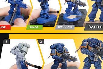 Contrast Paints son como pinturas transparentes, semejantes a una acuarela. Si empiezas desde una imprimación clara, lo más cercana al blanco posible, estas pinturas de baja viscosidad actúan de forma parecida a un sombreado acumulándose en los huecos pero con suficiente tensión superficial y opacidad para hacer un “velado” sobre el resto de la superficie de la miniatura y acumular poco tinte en las partes más elevadas. De modo que actúa como se ha visto en las fotos, sombrea, pinta y da una luz simple suficiente para tener un efecto resultón para jugar.