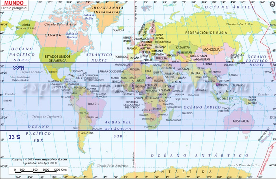 Figura1.Mapamundialconlatitudes.Encontramossombreadalafranjaentrelosdos paralelos 33º, donde se puede sintetizar vitamina D cutánea durante todo el año. Modificado de http://espanol.mapsofworldcom/mapa-del-mundo/mapa-del-mundo-con-latitud-y-longitud.html
