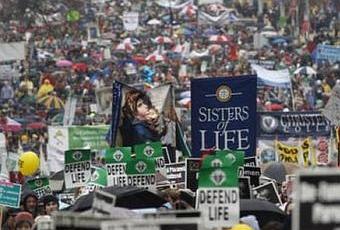 De obligado cumplimiento local (calles cortadas por el cortejo, etc.) en el Washington Post. Y peculiar tratamiento gráfico en este mismo periódico: todas las fotografías son primeros planos o planos con dos o tres o cinco o incluso diez personas... Quizá es que no encontraron buenas perspectivas o se les desenfocaron o estropearon los pixeles, pero el caso es que no hay un plano general, que busque dar una idea de conjunto. Y entre algunas fotos de detalle de pro-choicers, "oponentes" a la manifestación "pro life", siempre cabe alguna que no se detenga en ver unas monjas rezando el rosario (cosa aque está muy bien), y aparezca algo así: