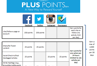 El programa que han lanzado se llama Plus Points. El programa consiste básicamente en ganar puntos a partir de una serie de acciones que aumenten la visibilidad de las marcas. Estos puntos se pueden canjear por premios como tarjetas de descuento de Best Buy o Itunes…, o por tarjetas canjeables en hoteles de la cadena, alquiler de coches o cruceros. La relación de acciones y puntos es: