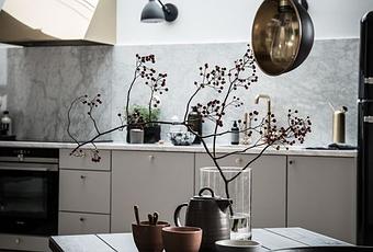 Si mezclamos mármol de Carrara, mobiliario negro y detalles en bronce con una perfecta iluminación de ambiente, conseguimos que la decoración sea sofisticada y elegante, como la de este pequeño ático sueco.