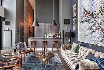En otoño, supongo que por el tema del frío, siempre apetecen casas llenas de texturas y tejidos "amorosos". Este elegante apartamento de dos plantas ubicado en la zona industrial "Dumbo" de Brooklyn, con impresionantes vistas al East River, nos ha encantado!Su diseño moderno y elegante, combina la estética industrial en tonos grises del hormigón y del acero, con muebles glamour total, piezas de arte, terciopelo, piel y cobre...Nos encanta su ambiente ecléctico y sus techos altísimos. Mucha luz, rincones con encanto y espacios con una decoración muy a la medida de sus habitantes.