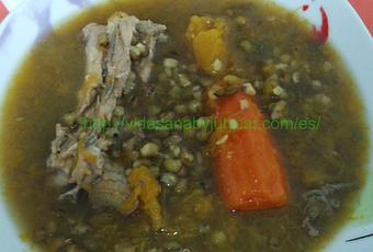 2 vasitos medidores de soja verde 1 espinazo de cerdo1 zanahoria1 trozo grandecito de calabaza (200gr cruda)10 vasitos medidores de agua 1 cucharadita de bovril de carnesalhoja de laurel