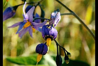 Llamada también uvas del diablo, Solanácea agridulce (Bittersweet Nightshade), es originaria de Europa y Asia, y ampliamente naturalizada en América del Norte, incluso como mala hierba invasora. Su flor violeta mide hasta dos centímetros de diámetro con cinco pétalos y un estambre alargado amarillo.