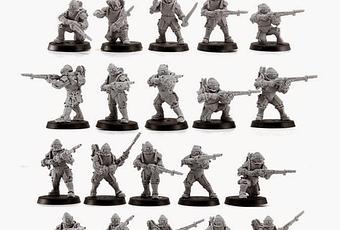 Es viernes y eso significa que es un día (Muy)movido en Forge World y Black Library.Empezaremos por FW que aunque tiene menos volumen de novedades,estas no son precisamente desdeñables.Y es que se ponen ya en pre-pedidos las primeras figuras de la Solar Auxilia(Uno de los germenes de la G.I actual y parte del Ejercito Imperial en aquella época),en este caso la Solar Auxilia Lasrifle Section.Aunque en Essen 2014 ya estarán a la venta,FW los pone hoy en pre-pedidos por 68 libras(85-88 euros,al cambio actual o al precio que los podrán en Essen 2014) por un total de 20 figuras(Grupo de mando de 5 individuos,que incluyen el sargento/teniente,vox y estandarte,mas 15 soldados de los "Tercios".Por que al parecer tienen un ligero toque español).Son obra de Edgar Skomorowski y estarán ya la venta en abierto el 30 de este mes.No me gustan del todo y no me gustan especialmente por el tema de los yelmos(Parece una olla a vapor),que junto con la especie de armadura de placas que portan y los rifles láser largos y finos que llevan,hace que tengan un aspecto muy steampunk,como esas pelis viejas de 20000 Leguas de viaje submarino donde la tripulación del Nautilus se pone sus barrocos buzos para bucear en el fondo del mar.Lo hubiera preferido de otra forma,aunque así es cierto que nadie puede sacar parecidos con nada de lo actual o de lo que dispongan los Astartes.Eso si,el que los yelmos tengan visera y no sean realmente una "cacerola" me parece una buena idea.