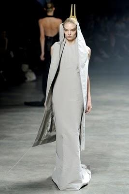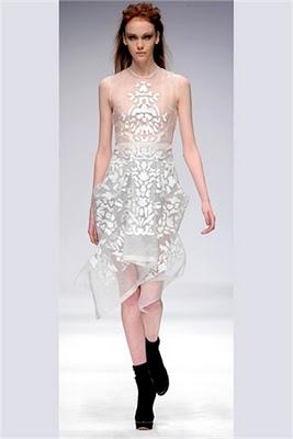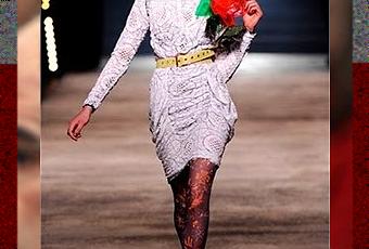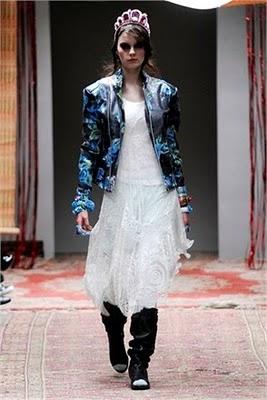 El más rompedor, vestido blanco con encajes, botas, cazadora estampada y corona de Meadhamkirchoff