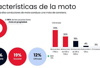 Según este informe anual, el comprador de moto es principalmente de alta cilindrada: siete de cada diez tiene una moto de carretera, mientras que el 19% apunta tener un scooter y un 12% señala que dispone de una moto off road. De todos ellos, sólo el 16% suele llevar acompañante habitualmente.