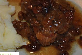 Incorporamos el vino, las pasas, el caldo y los dátiles. Llegados a éste punto podemos o no triturar la salsa, luego colocamos la carne dentro dejamos cocinar todo junto diez minutos.