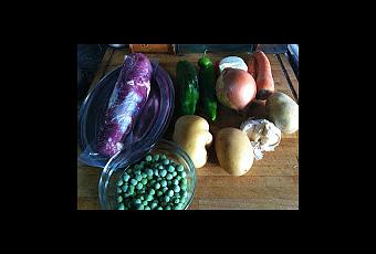 Primero pasamos por la sartén el solomillo, sal pimentado, hasta que esté bien hecho por todas sus partes. Con esto estamos consiguiendo que los jugos del solomillo se queden dentro y sea aún más jugoso cuando lo paladeemos. Luego ponemos a pochar la cebolla bien picada y el ajo. Conviene poner primero el ajo y cuando esté dorado echar la cebolla porque una vez esté este ingrediente en la cazuela, el ajo parará de hacerse y no se quemará. Cuando veamos que clarea la cebolla, añadimos un poco de vino blanco. Dejamos que evapore el alcohol y luego ponemos los pimientos, las zanahorias, cortada finas, y los guisantes. Cuando todo está bien pochado, cortamos las patatas en lonchas de 1 cm y dejamos que cojan un poco de color. Como el ingrediente principal es de campo, si tenemos un poco de orégano natural, o en su caso seco, se lo podemos poner para realzar este sabor.