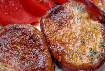 - Preparar los medallones de un solomillo de cerdo, envolviéndolos con una loncha de beicon doblada por la mitad a lo lardo, sujetándola con palillos. Salpimentar y sellar en una sartén con un chorrito de aceite, a fuego fuerte.