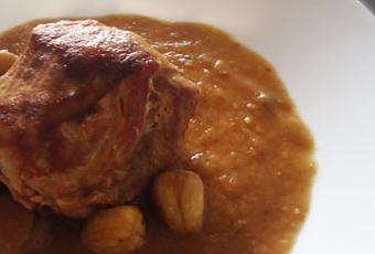 5. Añadiremos la mitad de las castañas a la cebolla, las rehogamos y a continuación agregamos el vino, dejamos que se evapore un poco y luego añadimos el caldo. Trituramos todo hasta que quede una salsa líquida, ponemos la carne en la salsa y dejamos hervir a fuego lento, a los 15 minutos de cocción añadimos el resto de las castañas enteras a la salsa, dejamos hervir otros 15 minutos más para que la salsa se reduzca y espese.