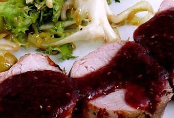 - Mientras, preparar la salsa de frambuesa, pochando 1 cebolla picada en aceite, a fuego suave, hasta que quede bien pochada. Añadir ½ bote de mermelada de frambuesas y ¼ de vaso de vino dulce (Pedro Ximénez), y se deja reducir. Se puede triturar con la batidora y poner en un cazo al calor mientras se hace la carne. Si espesa demasiado, añadir un chorrito de agua.