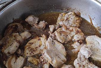 Retirar y en la misma sartén pochar la cebolla sazonada, a fuego suave, añadir un poco más de aceite para que no se pegue al fondo si fuera necesario. Cuando la cebolla empiece a volverse traslúcida, unos 8-10 minutos, sazonar y colocar los medallones de cerdo encima.