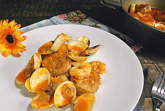 Ponemos en una cazuela un poco de aceite de oliva y doramos ligeramente las gambas peladas. Cuando empiecen a tomar color añadimos las rodajas de solomillo que habíamos reservado. Añadimos también el liquido de la maceración y cuando empiece a hervir añadimos las almejas. Dejamos cocer todo junto unos 10 minutitos en que las almejas se abrirán.