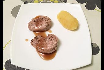 - Emplata colocando varias rodajas de solomillo, dos cucharadas de mermelada de cerveza por encima y un poco de parmentier de patata, colocándolo con ayuda de un molde metálico.