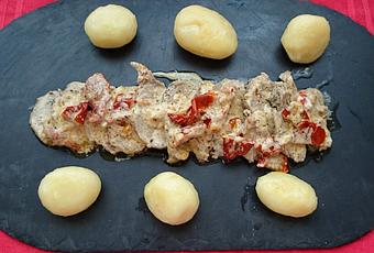 Pondremos los tomates a deshidratar. Cuando ya los tengamos deshidratados escurriremos el agua y les añadiremos un poco de romero, ajo picadito y aceite. Reservaremos. Cortaremos el solomillo en cuatro trozos para poderlo dorar mejor. Untáremos el lomo con aceite de oliva para que las especias se pegen mejor, le añadiremos la sal el tomillo, ajo picadito. Añadiremos en una sartén a fuego medio añadiremos a la sartén dos cucharadas de mantequilla y un chorrito de aceite, dejáremos que la mantequilla se derrita, añadiremos el solomillo y lo doraremos por los dos lados a fuego medio para que el solomillo no se nos reseque y se nos queme el ajo, cuando ya esté doradito añadiremos el vino taparemos y dejaremos al fuego hasta que reduzca el vino unos 15 minutos. Retiraremos el solomillo y reservaremos, subiremos el fuego y añadiremos el caldo. Añadiremos el tomate seco y dejaremos que hierva. Entonces añadiremos la pimienta la sal. Bajaremos el fuego y añadiremos la crema de leche hasta que esté totalmente incorporada y quede la salsa espesita. Cortáremos el lomo en filetes finos. Los. Añadiremos en una fuente y por encima añadiremos la salsa. ( yo añadí unas patatas para acompañar el plato)