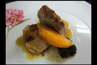 - Servir la carne cortada en rodajas, con los gajos y las ciruelas. Regar con un poco de salsa