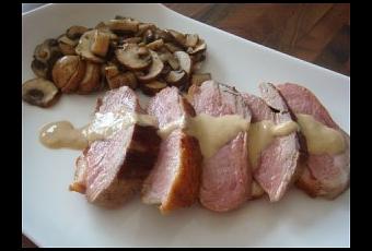 Sacamos el solomillo, cortamos en medallones y servimos con el champiñón y la salsa