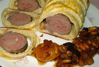 - Extendemos la lámina de hojaldre, la pinchamos con un tenedor y colocamos encima el solomillo, lo enrollamos con el hojaldre y cortamos lo que nos sobre. Debe montar un poco el final del hojaldre con el principio del mismo.