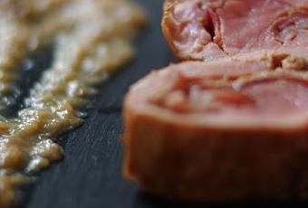 Una vez abierto el solomillo untamos el lado interior con el mouse de pato que tenemos preparado y después le colocamos unas lonchas de jamón de forma que cubran toda la superficie.