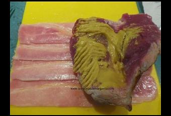Extendemos 3 lonchas de beicon, ponemos el solomillo en el centro. Untamos el interior con 1 cucharadita de mostaza).
