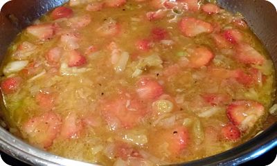 En ese mismo aceite sofríe la cebolla y cebolleta picadas, cuando estén pochadas añade las fresas picadas también. Remueve y deja que se vayan poniendo blandas, unos cinco minutos a fuego medio-bajo.