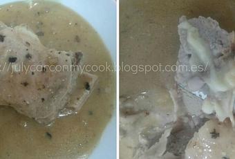 Sal pimentar el solomillo de pavo y cortar en dos trozos, poner el aceite de oliva en la cubeta de la GM E, menú freir ó GM D menú horno, sellar los solomillos por ambas caras, sacar y reservar,añadir los ajos y dorar un poco, añadir el vinagre, el agua, añadir loncha de jamón pavo, loncha de queso, encima el solomillo reservado, encima loncha de queso y encima loncha de jamón de pavo, cancelar programa, tapar con válvula cerrada, GM E menú turbo, 10 minutos ó GM D cocina 15 minutos, alta presión, cuando termine despresurizar manualmente, sacar el solomillo con el fiambre, a la salsa diluir la maicena y en menú plancha, espesar la salsa, servir el solomillo junto con la salsa