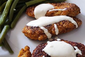 400 gr de solomillo o pechuga o contramuslo deshuesado de pollo 1 c/s de semillas de lino molido 1 cucharada de sal (para la mezcla de harina y especias secas) 1 c/p pimienta negra molida 1/2 c/s de pimentón dulce 1/2 c/s de pimentón picante 1 c/s de cebolla en polvo 1 c/s de salsa chimichurri